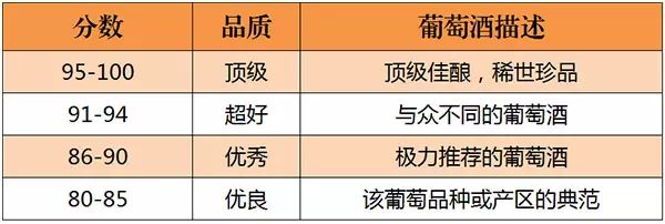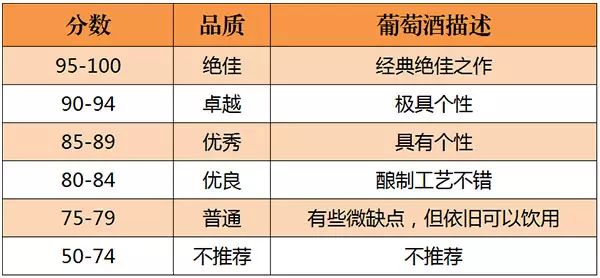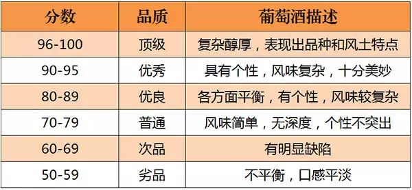 美國的《葡萄酒與烈酒》(Wine & Spirits)雜志是世界上最權威的葡萄酒雜志之一。自 1994年起,《葡萄酒與烈酒》也開始采取百分制對葡萄酒進行評分,葡萄酒首先會經過一些葡萄酒專業(yè)人士進行初次品嘗篩選,之后才會送到專業(yè)“評酒團”品評,所以該雜志評分的葡萄酒品質都不錯。評分標準如下所示: