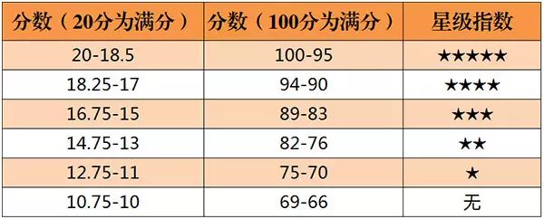 英國的《醇鑒》(Decanter,簡稱 DE)雜志始創(chuàng)于 1975 年,是一本專門介紹世界葡萄酒及烈酒的專業(yè)雜志。由于英國幾乎不生產葡萄酒,加上其王室在歐洲的崇高地位,大眾普遍認為英國對葡萄酒的評分會更客觀公正,因此《醇鑒》雜志在英語國家有著很大的影響力。該雜志評分采用 20 分制,0.25 分為最小單位,提供百分制換算,同時有從 0 星級到 5 星級的推薦規(guī)范: