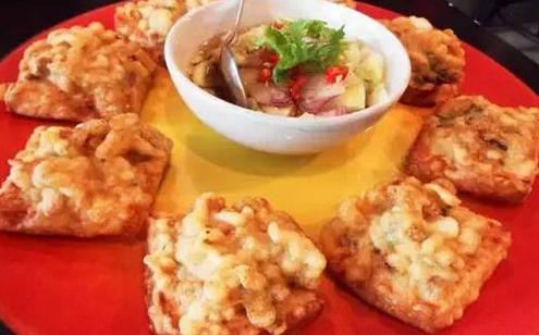 把去了殼的鮮蝦肉剁碎,打成蝦膠后,裹在甘蔗枝上置于鍋里油炸而成。外皮金黃酥脆,還粘著星星點點的面包糠,蝦肉由于吸收了甘蔗的清甜,既香,又鮮、嫩、甜。