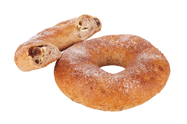 5.拍扁放軟質奶油奶酪和提子干,下半折再上折捏合面團,搓長。將一頭壓扁包入另一頭。(注意不要勉強搓長回縮的話先松弛幾分鐘再搓)